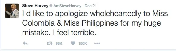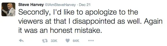 Steve Harvey very quickly apologised for the error and took full responsibility for it. I think there are a couple lessons for us to learn from this. I must say that I am a Steve Harvey fan and I think he has one of the best moustaches going around!